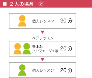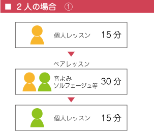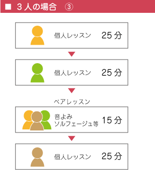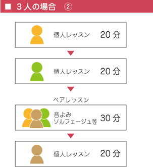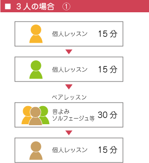 個人レッスンは基本的には30分ですが、 同学年又は同レベルの人と時間帯を前後することで、 下記のように、リトミック・ソルフェージュ・楽典などの時間が多く取れるようにしています